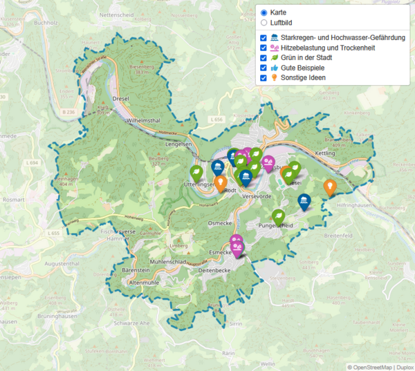 Auf dem Weg zum Klimaanpassungskonzept der Stadt Werdohl konnten sich alle Interessierten vom 9. Oktober bis zum 30. November 2024 mit Ihren Ideen und Anregungen zur lokalen Klimaanpassung in der digitalen „Ideenkarte zur Klimaanpassung in Werdohl“ beteiligen.